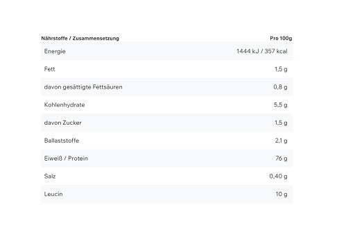 Sojaprotein 77 %, L-Leucin 10 %, Aroma, Kakaopulver (stark entölt), Zartbitterschokoladenstückchen 1,5 % (Kakaomasse, Zucker, fettarmes Kakaopulver, Emulgator (Lecithine (Sonnenblume))), Salz, Süßungsmittel (Sucralose, Steviolglycoside aus Stevia). Herkunft Zutaten: EU/Nicht-EU.